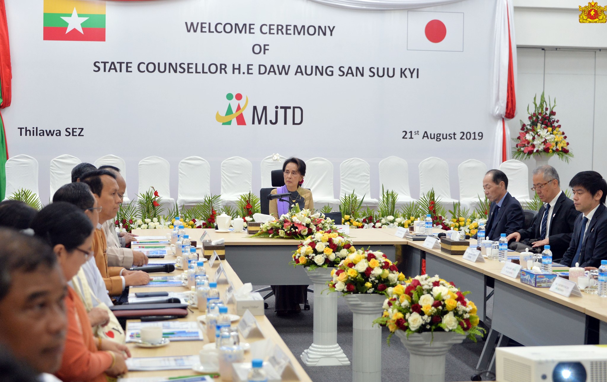 <p>State Counsellor Daw Aung San Su Kyi led Union Minister U Kyaw Tint Swe, U Min Thu, U Thaung Tun, Yangon Regional Chief Minister U Phyo Min Thein, Deputy Minister of Planning and Finance, in his capacity as Chairman of Thilawa SEZ Management Committee, Dr.Set Aung, Japanese Minister to Myanmar Mr.Ichiro Maruyama, Chairman of Myanmar Japan Thilawa Development Limited U Win Aung and President and CEO Mr.Tomoyasu Shimizu attended the ceremony concerning about the progress and ongoing business of the SEZ on August 21st at the Myanmar Japan Thilawa Development Limited. State Counsellor Daw Aung San Suu Kyi emphasized on the importance of coordination and cooperation among the relevant departments and the public during her inspection tour to Thilawa Special Economic Zone.</p>