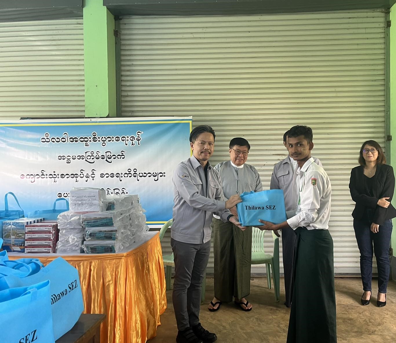Together with the initiation of the Community Relations Department of MJTD on behalf of TSEZ, Myanmar Thilawa SEZ Holdings Public Company Limited, Koyorad Myanmar Company Limited, Kianjoo Can (Myanmar) Company Limited, Boxpak (Myanmar) Company Limited, Suzuki Thilawa Motor Company Limited and Myanmar Yazarki Thilawa Company Limited provided additional support with essential stationery for these students.