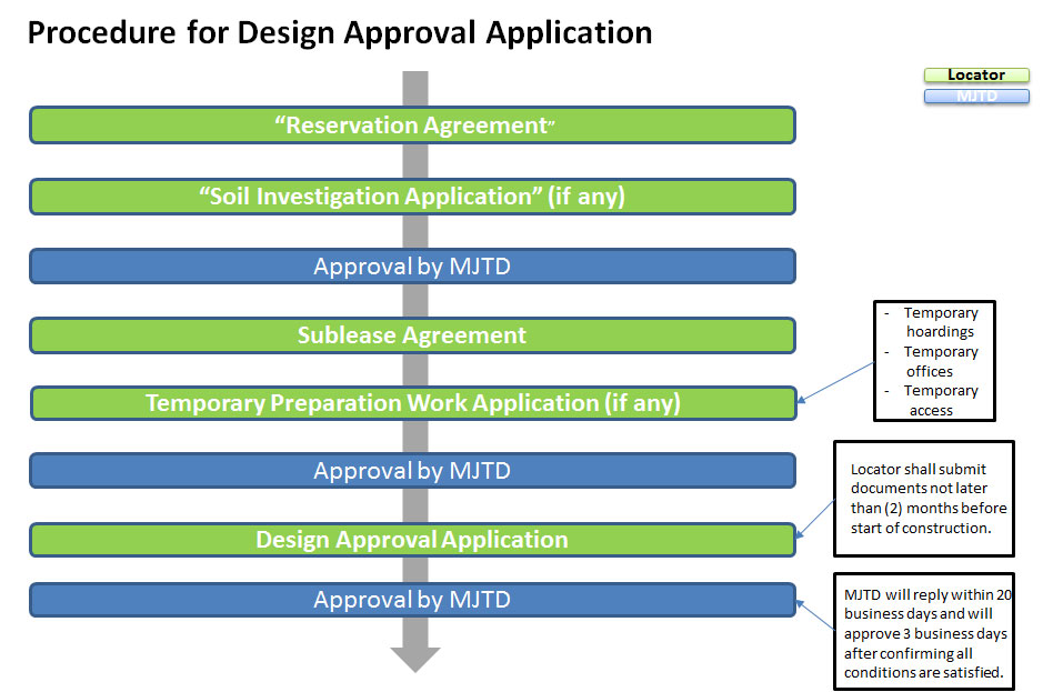 After Land Sublease Agreement is signed, Locators may apply temporary work by submitting a “Temporary Preparation Works Application (Format A-2)”. "Temporary Work" is for site preparation work only. Locator may start Foundation work and other permanent works after getting approval of Start of Construction from MJTD.