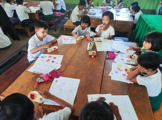 On February 2nd, the skill development activity was facilitated for a total of 146 students, including kindergarten and grade-1 students from two primary schools in the nearby Thilawa SEZ of Ah Lwan Suk Village and Aye Mya Thida (Pha Lan) Ward. The Community Relations Department spearheaded the event, with participation from volunteers from MJTD and locators Kianjoo Can Myanmar Co., Ltd, Boxpak Myanmar Co., Ltd, and Indorama Ventures Packaging Myanmar Ltd, providing support and actively engaging with the children throughout the entire activity.