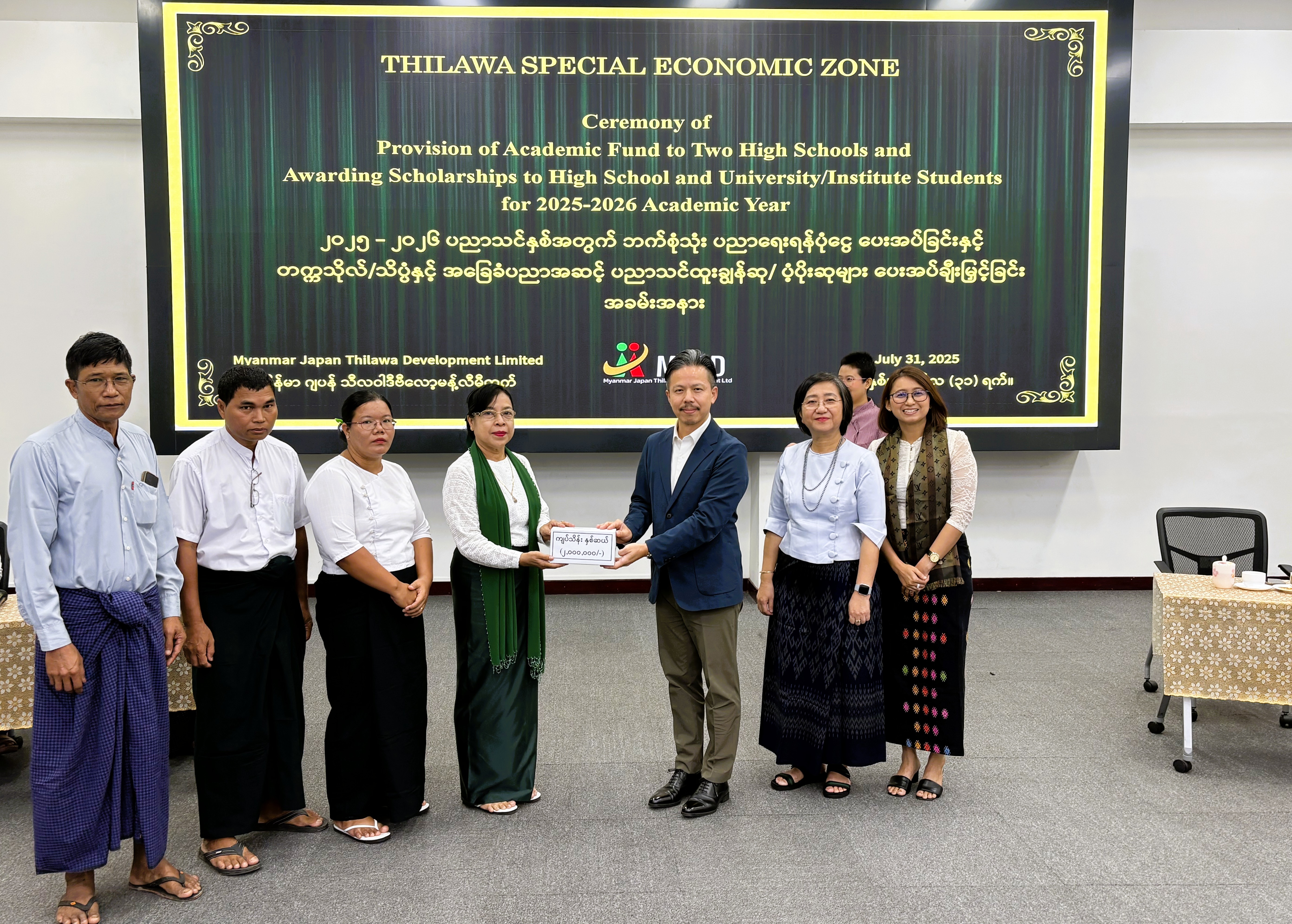 The Thilawa Special Economic Zone (TSEZ) proudly hosted an Academic Fund Awarding Ceremony at MJTD’s Multipurpose Hall on 31st July 2025, celebrating its continued commitment to educational development in the surrounding community.